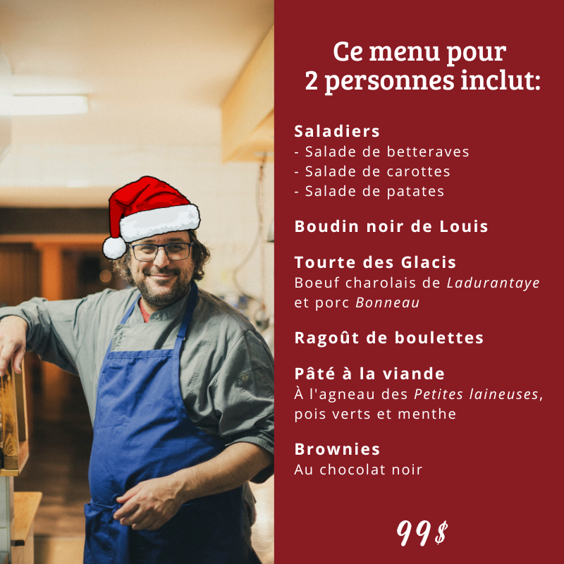 Comme nous serons fermés du 23 au 26 décembre inclusivement, on vous propose un souper de Noël comme à l'auberge! Voici le grand retour de notre boîte-repas d'inspiration des Fêtes aux produits du terroir, concoctée par notre chef Louis Bouchard Trudeau! Faites vite, les quantités sont limitées!